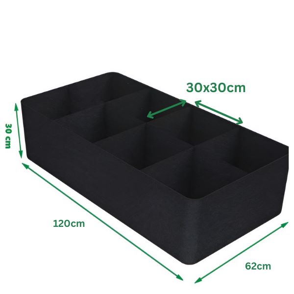 Tento látkový vyvýšený záhradný záhon sa dodáva v dizajne s 8 roštami s rozmermi 120 x 62 cm a výškou 30 cm.