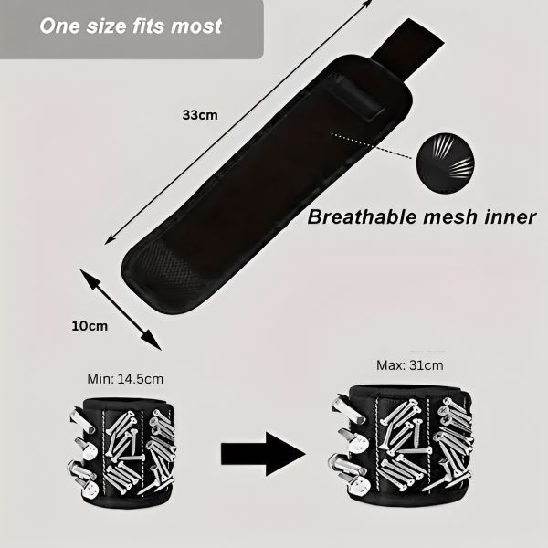 Silné magnety v tomto náramku ľahko obopnú vaše zápästie a udržia malé kovové predmety, ako sú skrutky, klince a skrutky, priamo na dosah ruky.