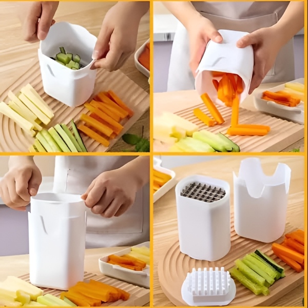 Kuchynský nástroj CHOPZY nie je určený len na hranolky; je to univerzálny krájač zeleniny, ktorý si poradí s rôznymi surovinami, ako sú mrkva, uhorky či cibuľa, a uľahčí vám prípravu jedál.