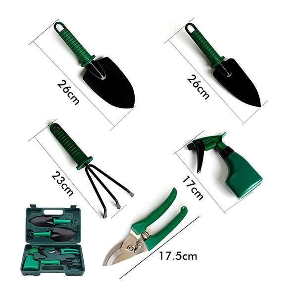 1 x Súprava záhradného náradia s úložným boxom: 1x hrabličky na burinu, 2x sadiace lyžice, 1x záhradné nožnice, 1x rozprašovač.