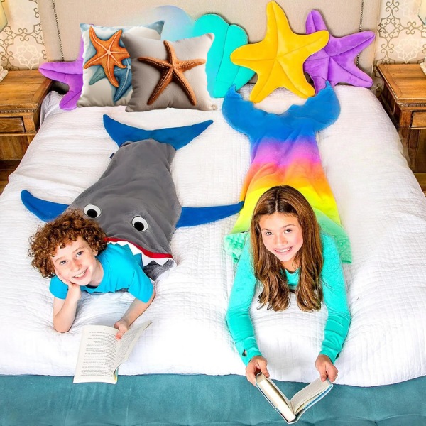 Vyberte si medzi prikrývkou so žraločím chvostom alebo chvostom morskej panny. Táto deka je ideálna pre energické deti, ktoré sa rady hrajú na role, uspokojí ich divokú stránku a zároveň ich udrží v teple.