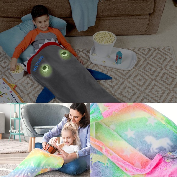 Mäkký, vysokokvalitný flanelový fleece udrží deti v teple, zatiaľ čo odpočívajú po škole alebo sa v noci prevaľujú. Je ideálny na zachumlanie sa na gauči pri sledovaní rozprávok alebo na zahriatie počas chladných nocí. Vaše deti sa budú chichotať od radosti, keď sa schúlia do chvosta žraloka alebo morskej panny.