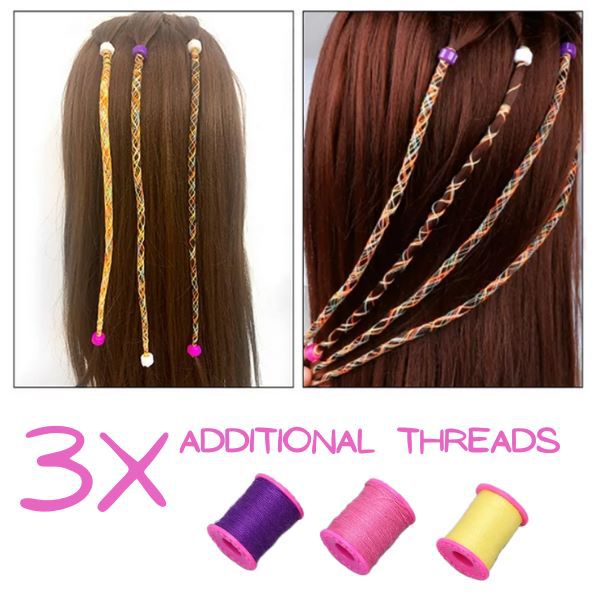- Balenie obsahuje: 1x strojček na zapletanie vlasov, 12x sponky do vlasov, 3x niť (žltá, ružová a fialová niť), 2x príslušenstvo pre jednoduchšie použitie.